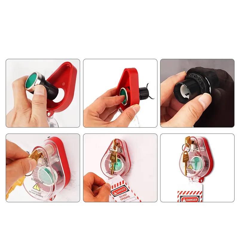Блокиратор пусковой кнопки со встроенным замком DPJ1. Ключ и тело блокиратора имеют одинаковый уникальный номер для простой и быстрой идентификации.